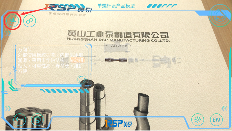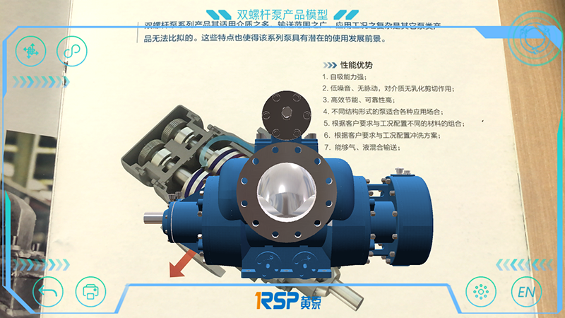 黃泵AR的第一個功能“AR產(chǎn)品”可通過手機(jī)、IPAD等移動設(shè)備的相機(jī)掃描對應(yīng)圖片,在相機(jī)視角展示黃泵三、雙、單螺桿泵產(chǎn)品的三維建模,并包含產(chǎn)品零部件拆解介紹、播放工作原理動畫等功能。
