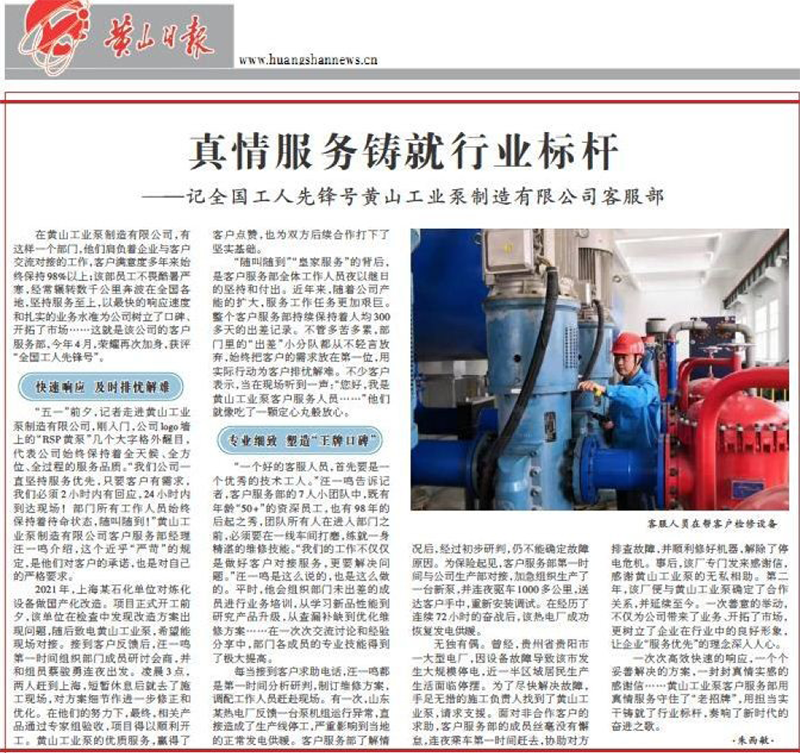自2022年1月全總印發(fā)《關(guān)于推薦評(píng)選2022年“全國五一勞動(dòng)獎(jiǎng)”和“全國工人先鋒號(hào)”的通知》以來,公司工會(huì)認(rèn)真組織,努力把公司客戶服務(wù)的先進(jìn)事跡和優(yōu)秀團(tuán)隊(duì)精神展現(xiàn)出來,歷經(jīng)初審、省級(jí)公示、復(fù)審以及最終名單公示,最終公司客戶服務(wù)部獲得該項(xiàng)榮譽(yù),同時(shí)RSP黃泵也是黃山市唯一獲此殊榮的單位。